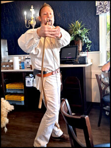 His long bow was made by a member of a tribe in the eastern states. He demonstrated how to string it for use. Unfortunately, he was not able to bring and show his Hawkins black powder rifle into the facility so a picture had to suffice. He described living conditions, the things mountain men did, and as much history as time would allow.